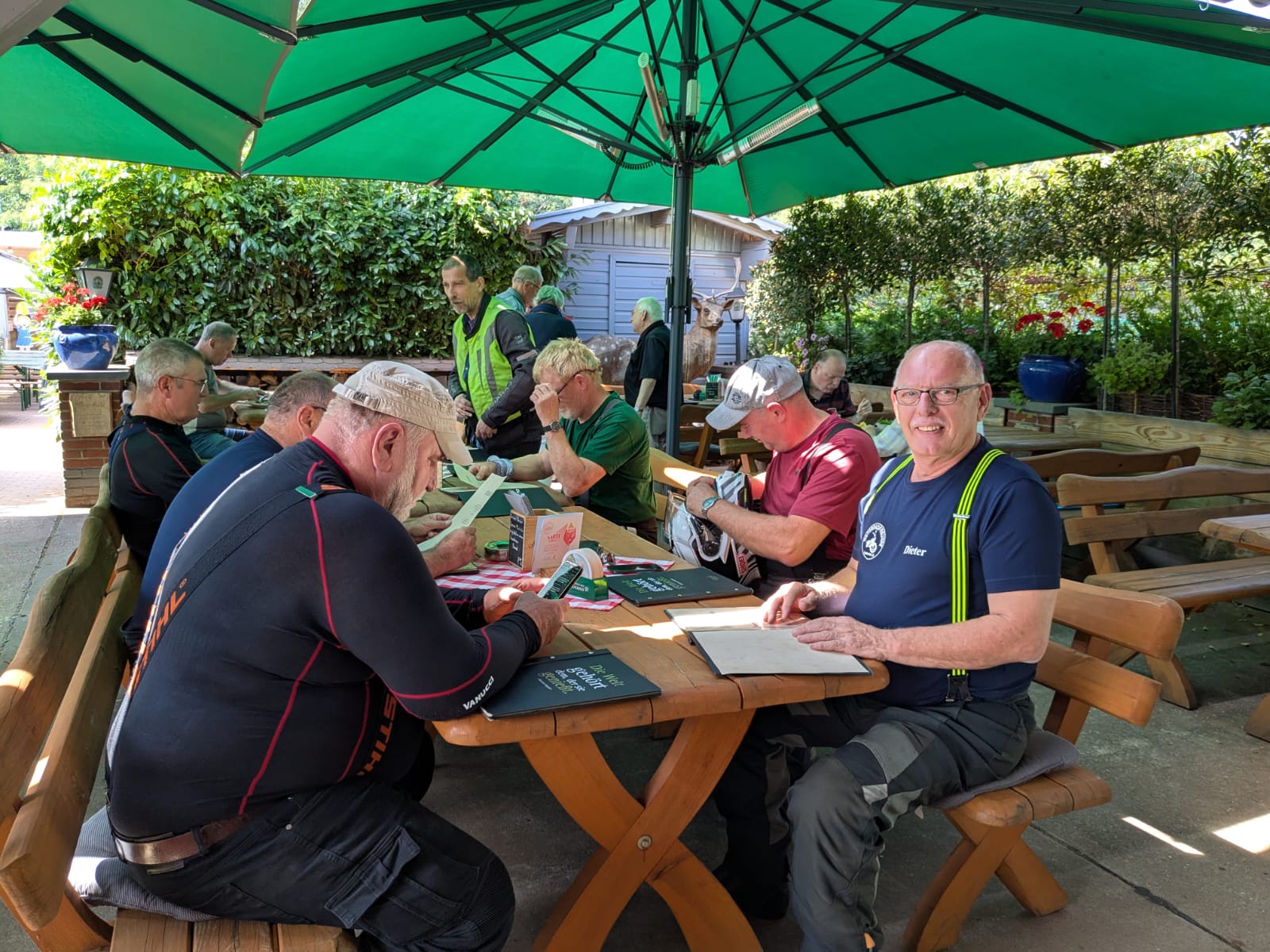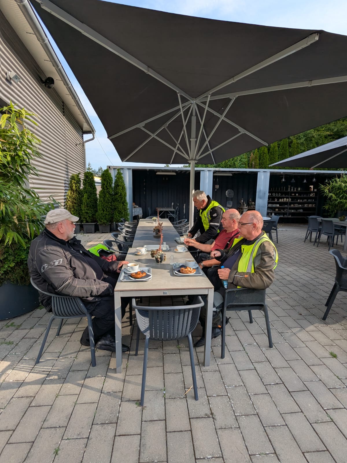 Mit 13 Bikes ging’s über herrlich kurvige Straßen in den Odenwald, wo beim Seitenbacher die erste Pause eingelegt wurde. Kaffee, Brezeln und gute Laune – was will man mehr? Nun ja, vielleicht den Rucksack, den ein Mitfahrer dort vergessen hatte. Der durfte dann noch eine kleine Extra-Runde drehen, um sein Gepäck wieder einzusammeln. Zum Glück ging nichts verloren, außer ein paar Kilometern Benzin.