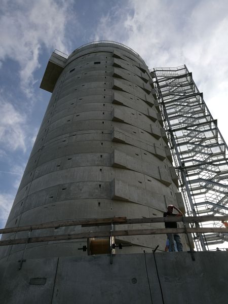 In der Zwischenzeit war der Bus an der Windenergieanlage 3 (WEA3) angekommen. Hier wurde das Prinzip des Passiv- und Aktivbeckens der Windräder erklärt: Das Passivbecken mit 63 m Durchmesser dient als Pufferspeicher, bevor das Wasser über das Aktivbecken – eine 40 m hohe Betonsäule mit 18 m Durchmesser – abgeführt wird. Aus dem Aktivbecken gelangt das Wasser bei Bedarf in die Druckleitung und erzeugt in den Turbinen nach einer Höhendifferenz von etwa 200 m den Strom für die Regelenergie um Stromschwankungen der regenerativen Energieanlagen abzufangen. Am WEA3 wurde in dieser Woche der erste Kletterkran installiert, um mit der Montage der eigentlichen Windräder beginnen zu können. Der Kran wird während der Montage auf eine Höhe von max. 192 m hinaufklettern. Die Nabenhöhe der Windräder liegt auf bis zu 175 m. Die Windräder werden einen Rotordurchmesser von 137 m haben und eine Gesamthöhe von bis zu 246,5 m erreichen.