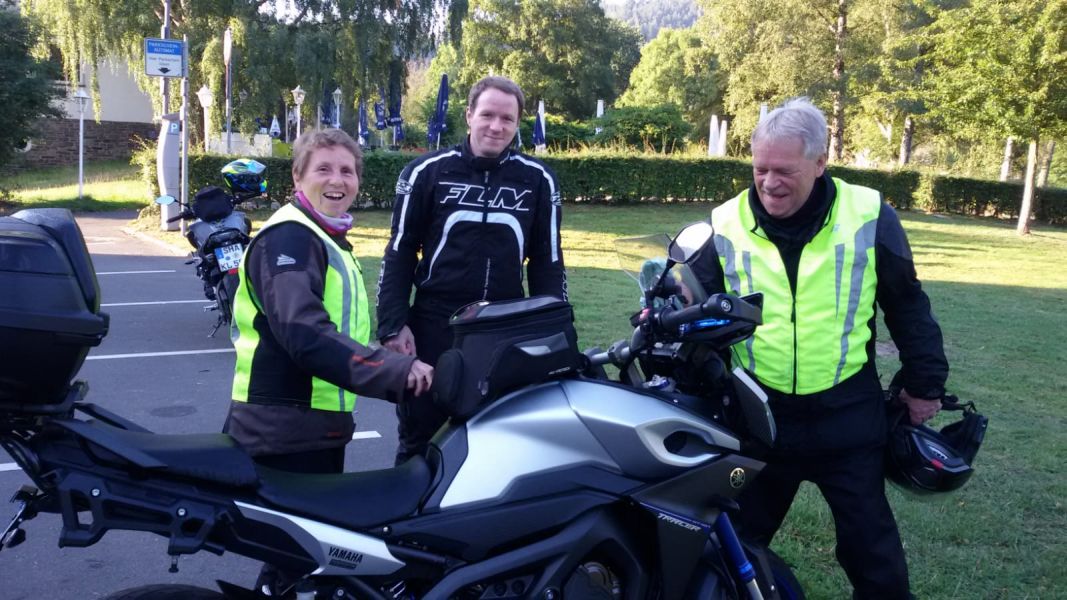 Am Freitag um 9:00 Uhr machten sich 15 Motorradfreunde auf den Weg in die Eifel, in Mainhardt kamen 5 Weitere hinzu. Das erste Ziel war die Moonlight Ranch bei Eppingen, wo 3 Weitere auf uns warteten. Als bei Großbottwar der Tourguide merkte, dass er die Schwarzwald-Tour im Navi hatte, hat kurzerhand Dieter die Truppe zur Ranch geführt. Mit 1h Verspätung ging es dann los. Sinsheim, Autobahn A61 zum Hunsrück zur Mittagspause. In Maria Laach sind wir zum See, (Maar) zu einer Kaffeepause abgefahren. Von dort durch die Eifel mit Kurven ohne Ende zum Hotel Seemöwe in Einruhr. Zimmer, Frühstück und Abendessen toll.