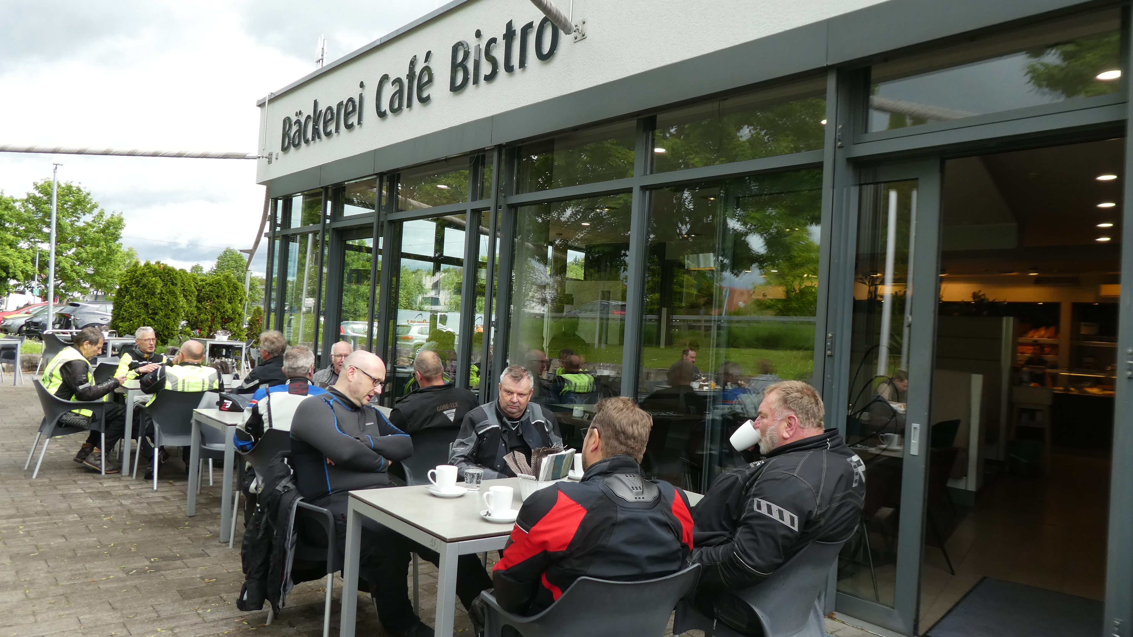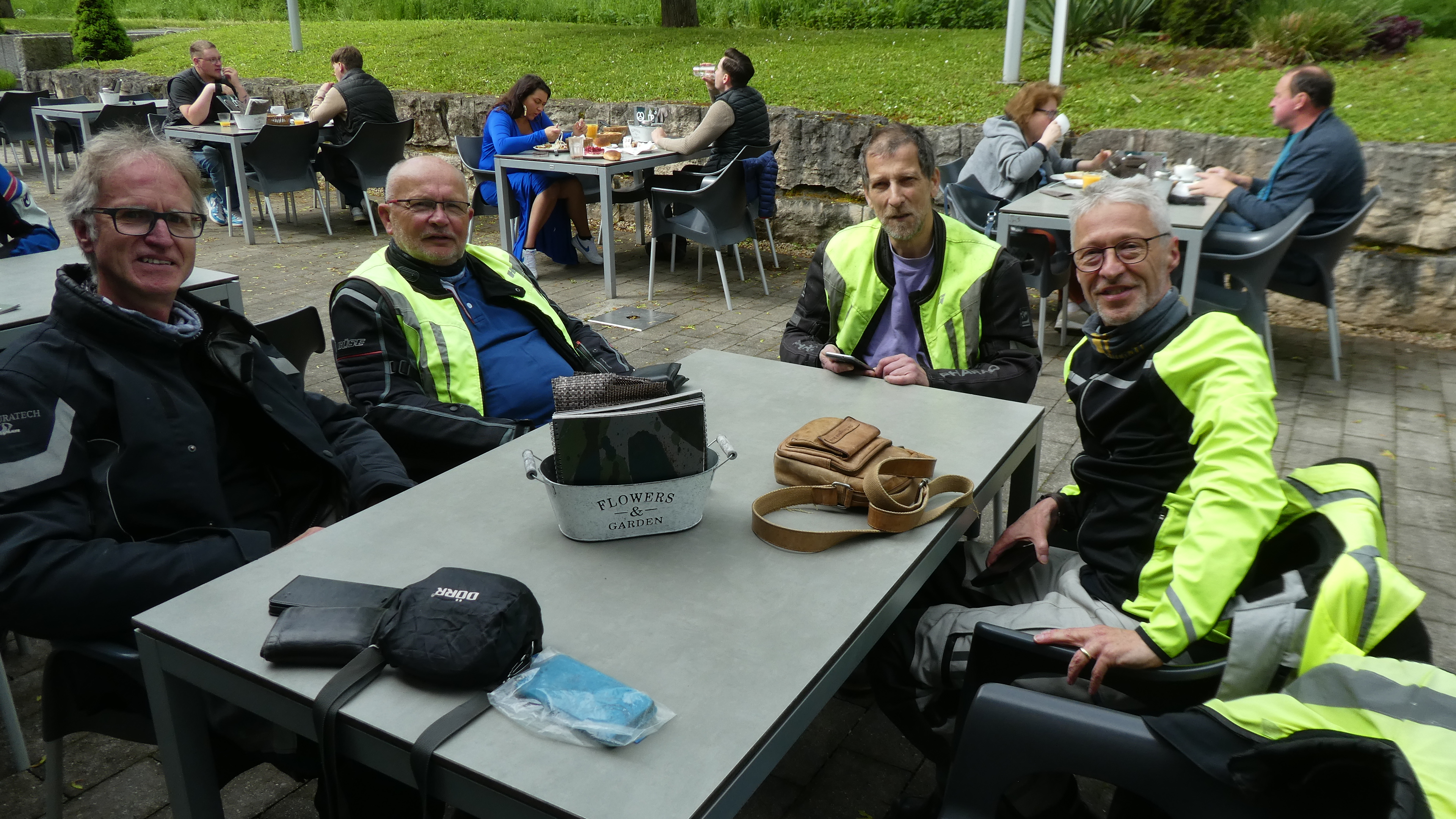 So richtig gut meinte es der Wettergott nicht mit den Motorradfreunden bei der Sonntagsausfahrt am 5. Mai. Gemessen an den düsteren Regenprognosen der diversen Wetter-Apps hatte er dann aber doch ein Einsehen, und dann soll man sich ja auch nicht beklagen. So starteten 13 Motorradlerinnen und -radler auf 12 Motorrädern einigermaßen frohgemut unter der Führung der Tourguides Ecki und Volki um 9.30 Uhr wie üblich von der Aral-Tanke in Unterrot. Im ersten Streckenabschnitt führte die Tour über Mainhardt und Reisach nach Obersulm-Willsbach, wo wir bei der Bäckerei Trunk die übliche kurze Kaffeerast einlegten. Das Wetter war dort so angenehm, dass wir sogar im Freien sitzen konnten. Von dort mopedelten wir weiter über Schwabbach bis nach Ohrnberg, wo wir in das zauberhafte Ohrntal einbogen, durch das sich die Straße an den kurvigen Flusslauf der Ohrn anschmiegt. Leider stellte sich unpassenderweise gerade dort ein heftiger Regenguss ein, so dass die Fahrer nicht so frei durchwedeln konnten wie bei trockener Straße. Über wunderschön kurvige, leere und oft trockene Straßen steuerten wir, vorbei an Schöntal, Berolzheim und Gerichtstetten unsere Mittagslocation an, den Goldenen Adler in Wertheim-Höhefeld. Dieses kleine Dorf liegt irgendwo im Nirgendwo, oder wie Harald es etwas despektierlich ausdrückte, in „Fränkisch Sibirien“. Umso gastfreundlicher aber waren die Wirtsleute und das Personal. Obwohl das Gasthaus proppevoll war, bekamen wir sehr zügig unsere reichlich bemessenen Mahlzeiten zu einem mehr als fairen Preis. Vor der Abfahrt ließ es sich die Seniorchefin nicht nehmen, noch in der Küchenschürze jedem von uns eine Schokoladenpraline in Form eines Glücksklees mitzugeben, da wir Motorradfahrer ja den sonst offenbar üblichen Schnaps ablehnen müssen. Solchermaßen gestärkt – also mit spannendem Bauch – machten wir uns Richtung Heimat auf. Der Weg führte uns Richtung Tauberbischofsheim und Bad Mergentheim großteils abseits der Bundesstraßen nach Gerabronn. Auf die dort geplante weitere Kaffeepause verzichteten wir. Im weiteren Verlauf der Tour waren die Straßen dann doch sehr nass, weil kurz vorher offenbar ein großflächiger und ziemlich kräftiger Regen niedergegangen war. Deshalb war beim Fahren weiterhin erhöhte Vorsicht das Gebot der Stunde. So landeten wir über Ilshofen, Vellberg, Obersontheim und Gaildorf nach rund 280 Kilometern wieder allesamt wohlbehalten in Unterrot. Wolfgang wurde anschließend verpflichtet, immer an den Sonntagstouren teilzunehmen, denn immer wenn er die Regenjacke überzog, gab es keinen Regen. Wir danken allen, die dabei waren, für’s Mitreisen im Volki-Ecki-Express und für’s disziplinierte Fahren.